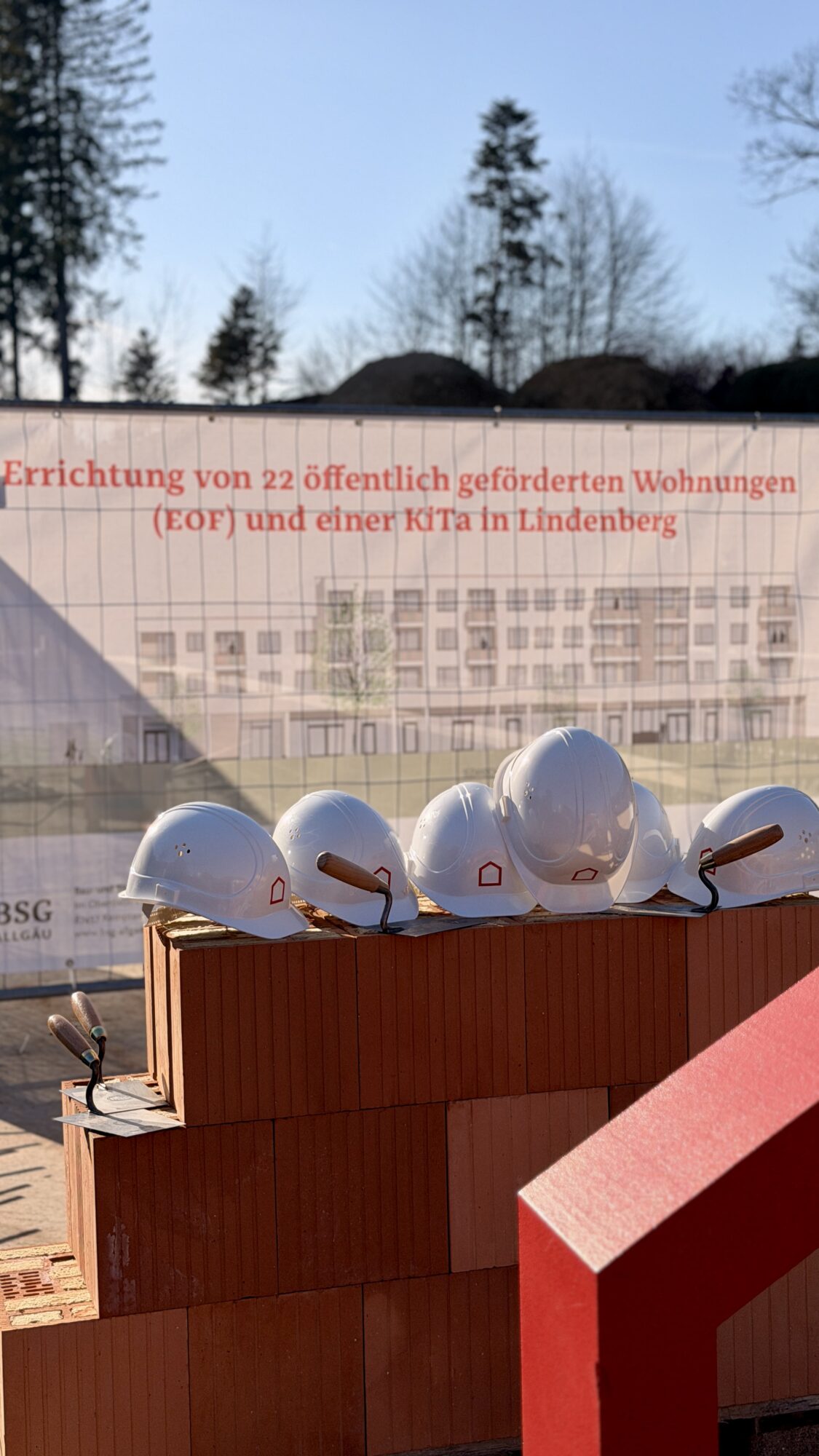 In der Peter-Dörfler-Straße in Lindenberg entsteht aktuell ein besonderes Bauprojekt: Gemeinsam mit der Stadt Lindenberg bauen wir auf einem Grundstück der Firma Liebherr-Aerospace GmbH eine neue Kindertagesstätte sowie 22 öffentlich geförderte genossenschaftliche Mietwohnungen. Am 4. März feierten wir die symbolische Grundsteinlegung.
